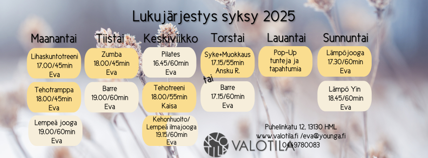 Valotila tarjoaa liikettä keholle ja mielelle. Monipuoliset viikkotunnit, kurssit, workshopit, tapahtumat ja teemaillat tarjoavat makuja monenlaiseen nälkään. Haluat sitten joogata, treenata, jumpata, tanssia tai vain rauhoittua, on Valotila Sinua varten. Tunneille voi tulla mukaan kertamaksulla ja oman aikataulunsa mukaan. Kaikki tunnit sopivat ensikertalaisillekin.