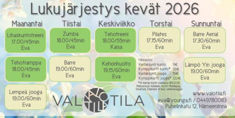 Kevään lukujärjestys 13.4.-18.6.2026. Tunneissa voi olla kauden aikana muutoksia. Ajankohtaisen kalenterin löydät varauskalenterista.